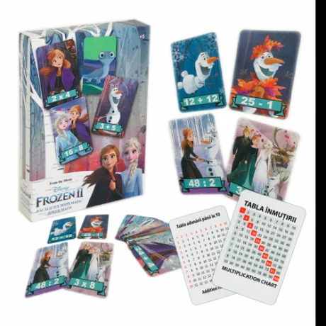 Pacaliciul matematic Frozen Disney contine 48 carti cu operatii matematice, o carte joker, tabla inmultirii, tabla adunarii si instructiuni de joc. Jocul trezeste interesul copiilor pentru invatarea matematicii.